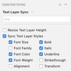 Syncing styles can be enabled per layer. To do this, toggle the Sync Text Layer Styles option on the ContentSync Layer Inspector. Then each style property can be toggled to sync.